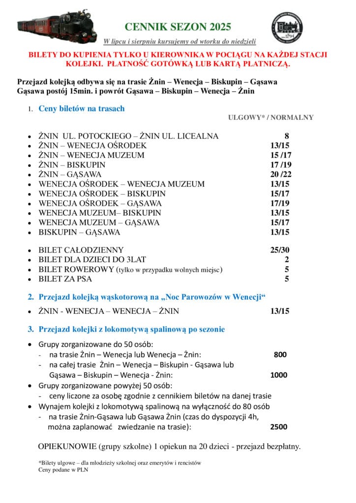 Wszelkie bieżące informacje dotyczące działalności kolejki oraz cennika i rozkładu jazdy znajdują się na stronie Muzeum Ziemi Pałuckiej: mzp.gminaznin.pl oraz na profilu fejsbukowym ŻKW: https://www.facebook.com/profile.php?id=61566316640971
