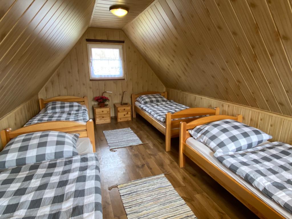 Drewniany piętrowy domek wczasowy dla 5 osób, położony pomiędzy jeziorem i stawem. Na parterze znajduje się salon z tapczanem, aneksem kuchennym i łazienką. Na piętrze znajduje się sypialnia z czterema łóżkami. Domek jest ogrzewany elektrycznie.